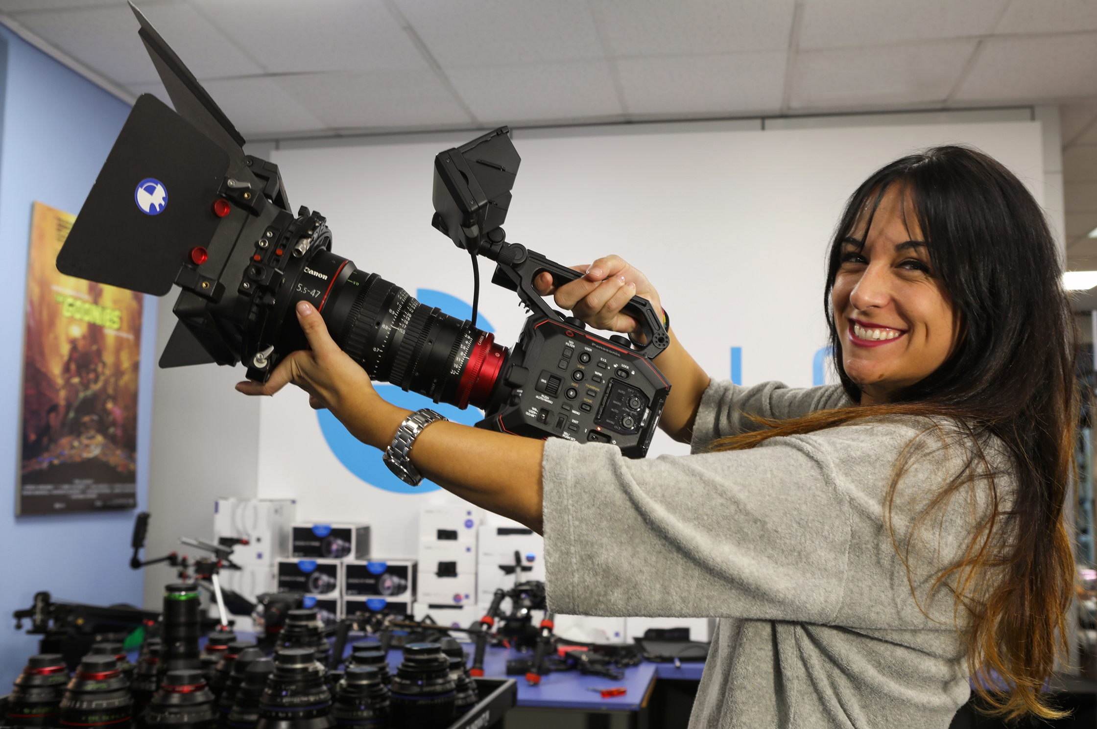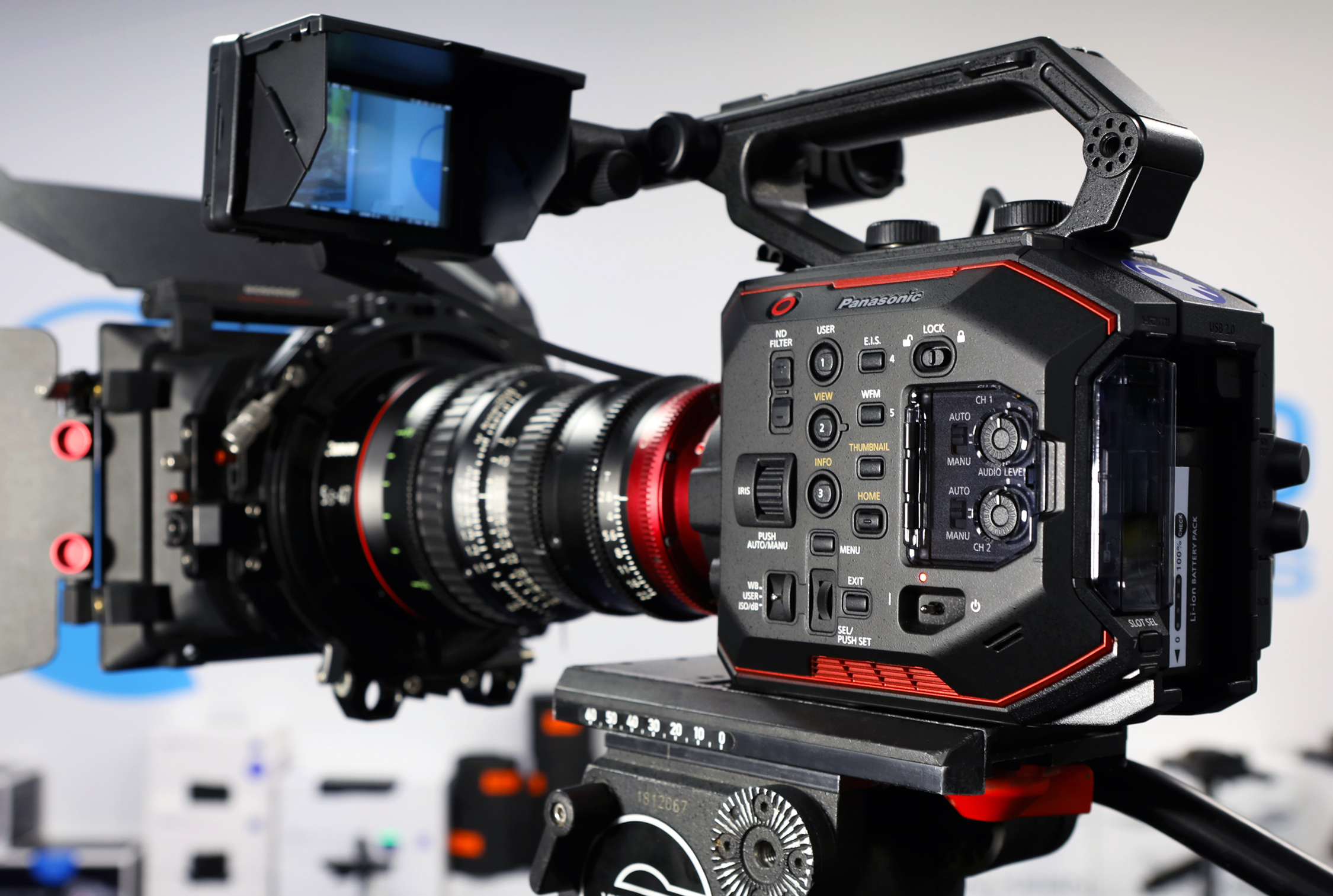 Cámara Panasonic AU-EVA1: Sensor Super 35mm 5,7K, 14 niveles de rango dinámico, dual ISO 800/2500, Montura EF, graba en 4K 10 bits 4:2:2 y RAW.