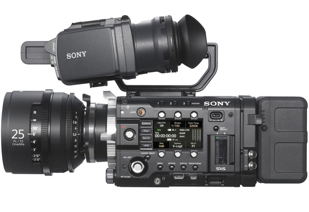 Cámara SONY PMW-F55: Sensor Super 35, 4K, ISO 1250, montura PL CINE, 60 fps, 14 stops, grabación en XAVC/SRMaster/MPEG2, salida HDSDI/HDMI.