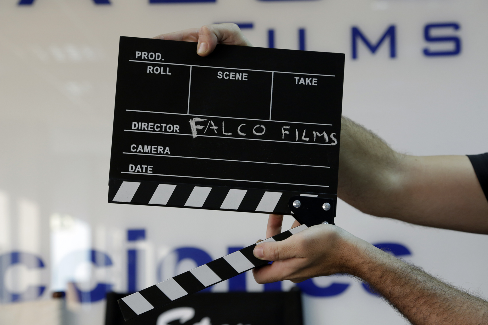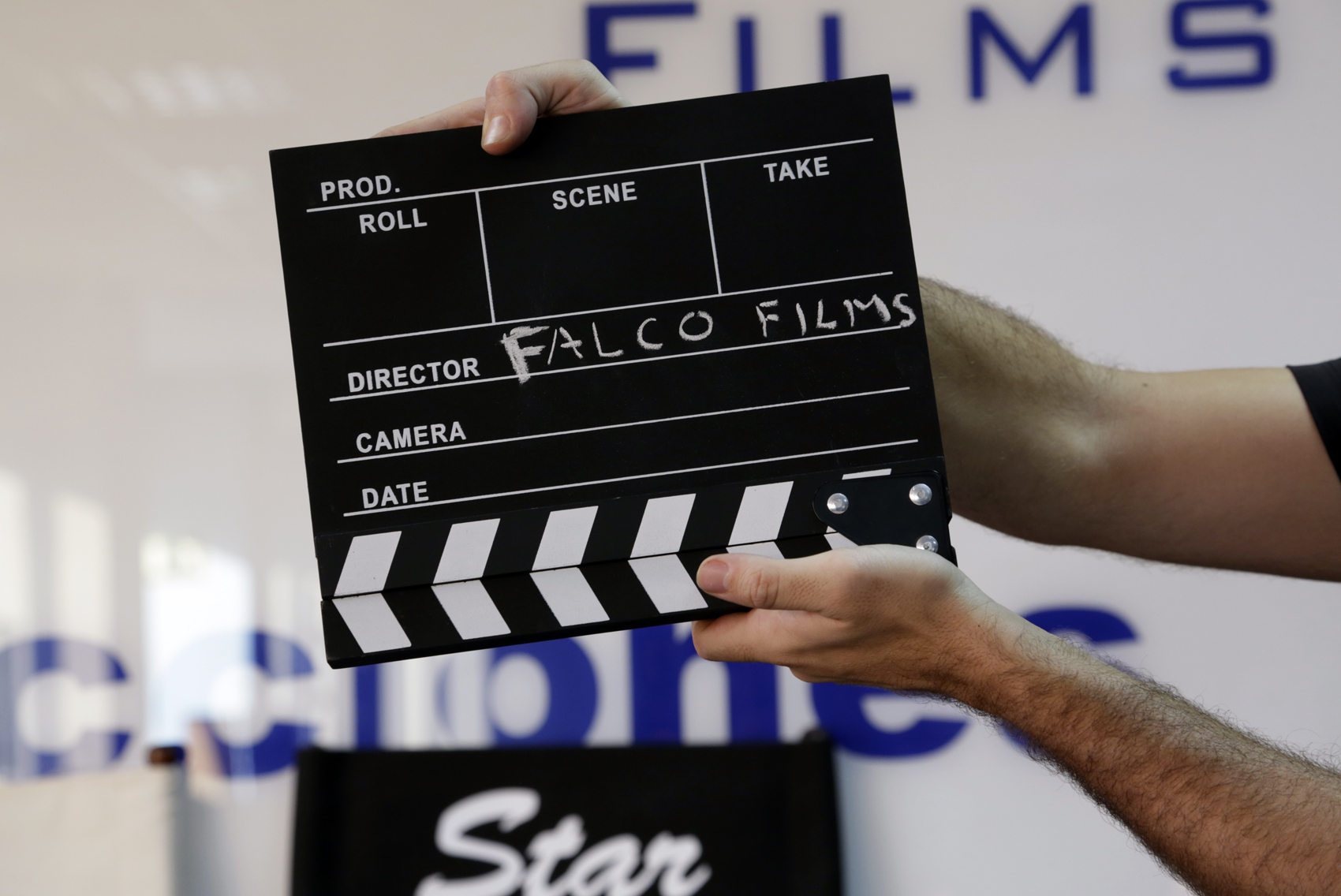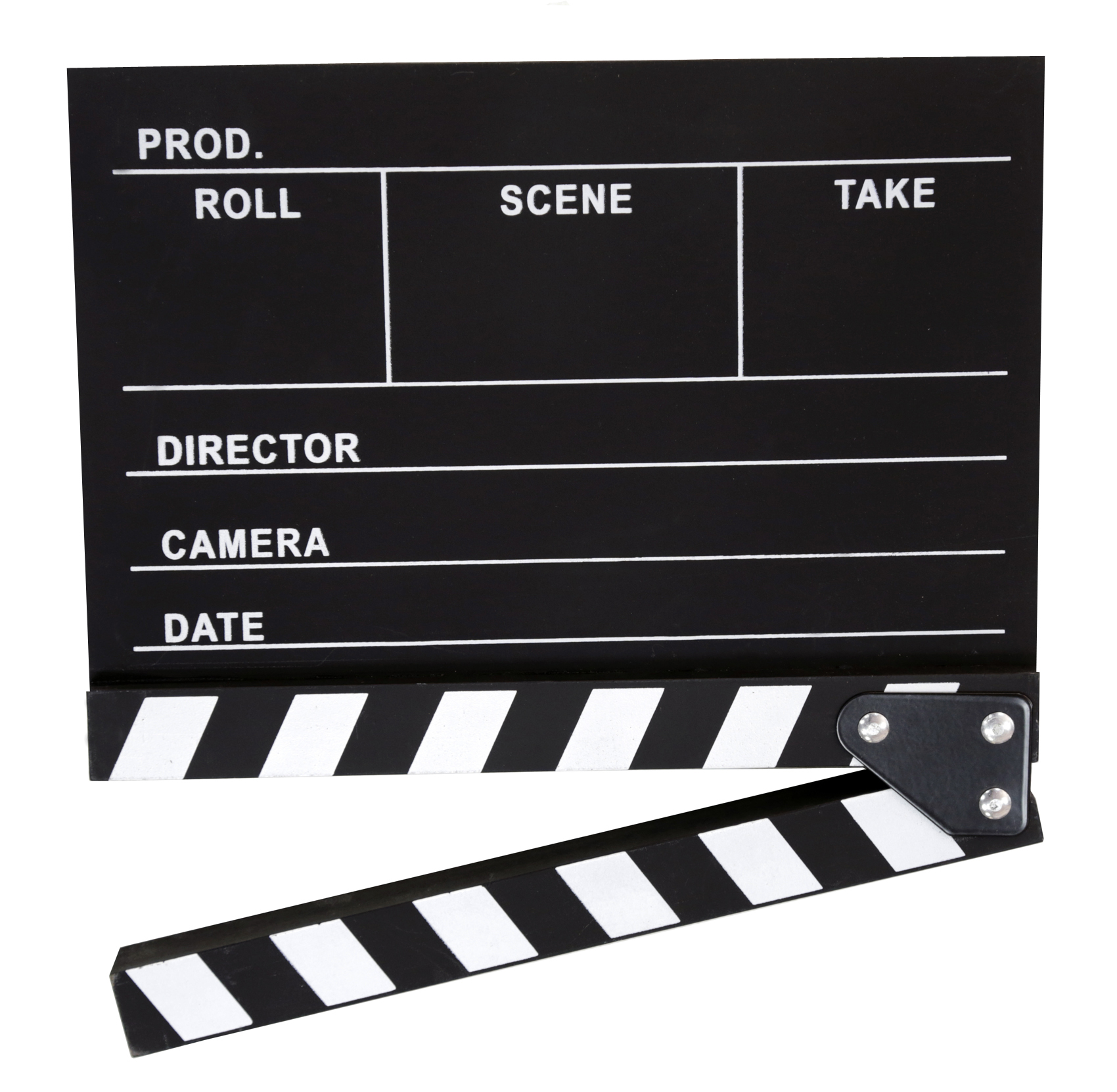 Claqueta de cine clásica, madera y pizarra, para tiza; ideal para producción audiovisual. Medidas: 32 cm x 30 cm.