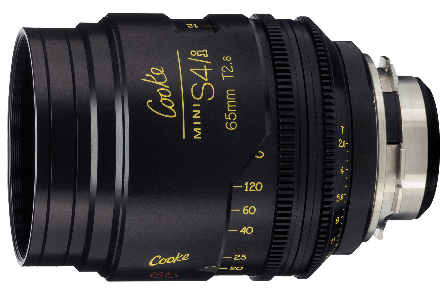 Lente Cooke S4/I Mini 65mm con resolución superior a 4K, apertura T2.8-T22, captura de metadatos, colorimetría balanceada y rotación de enfoque de 300°.