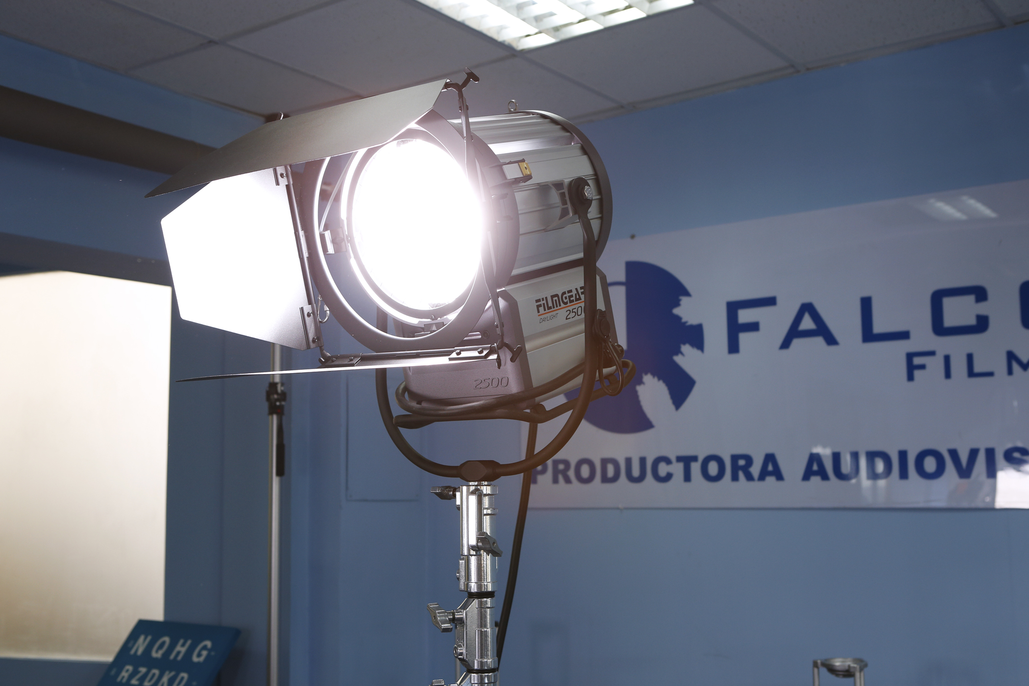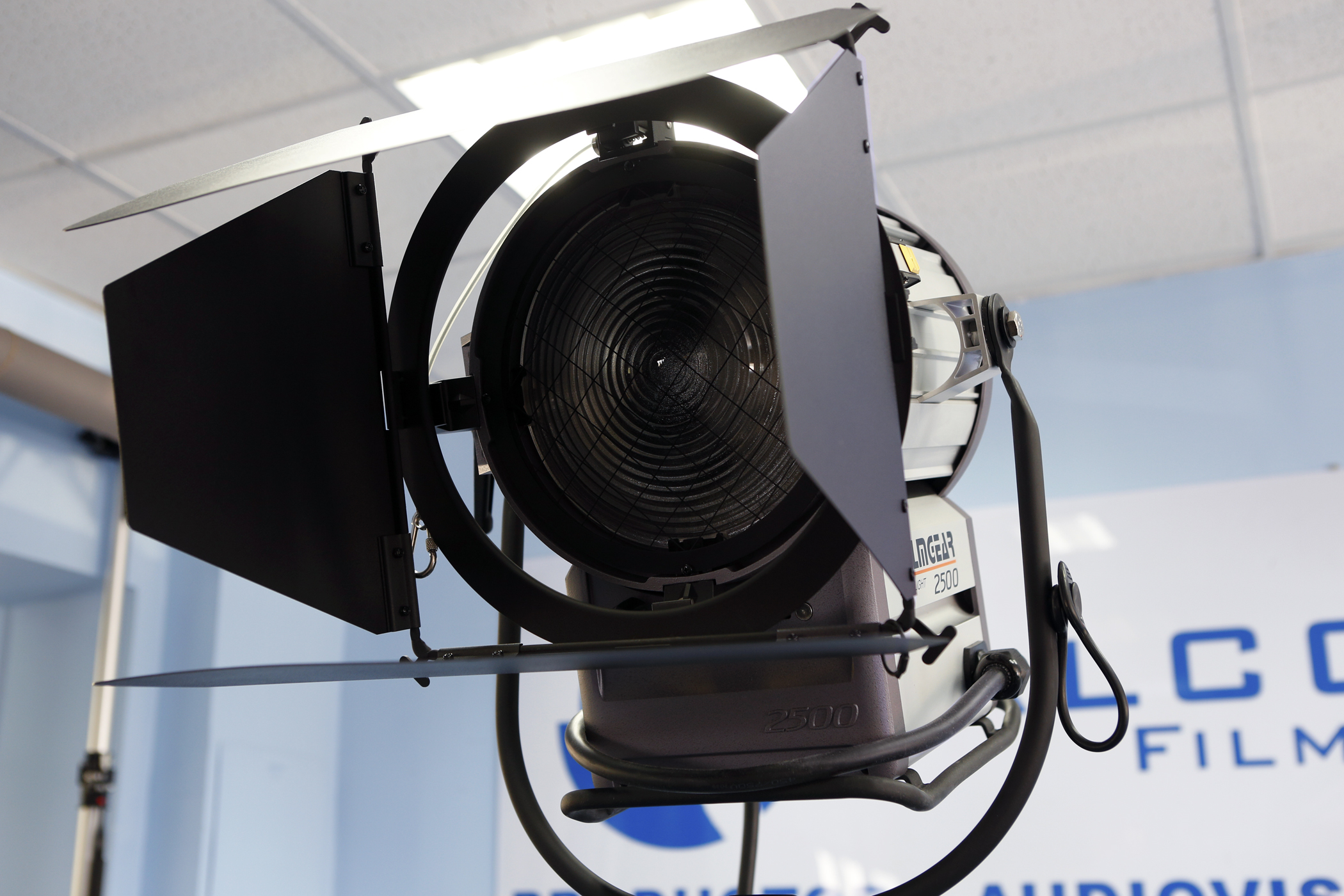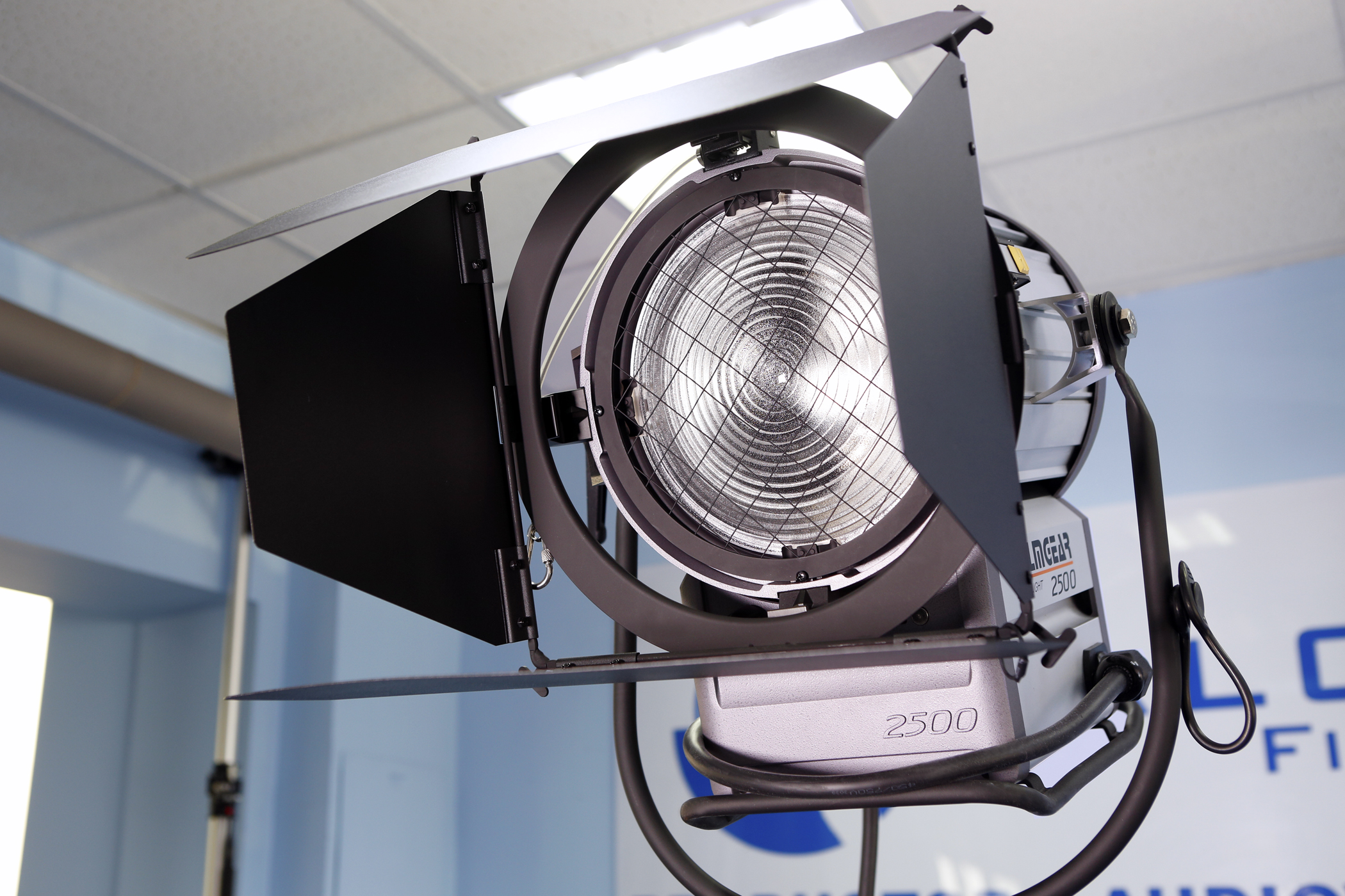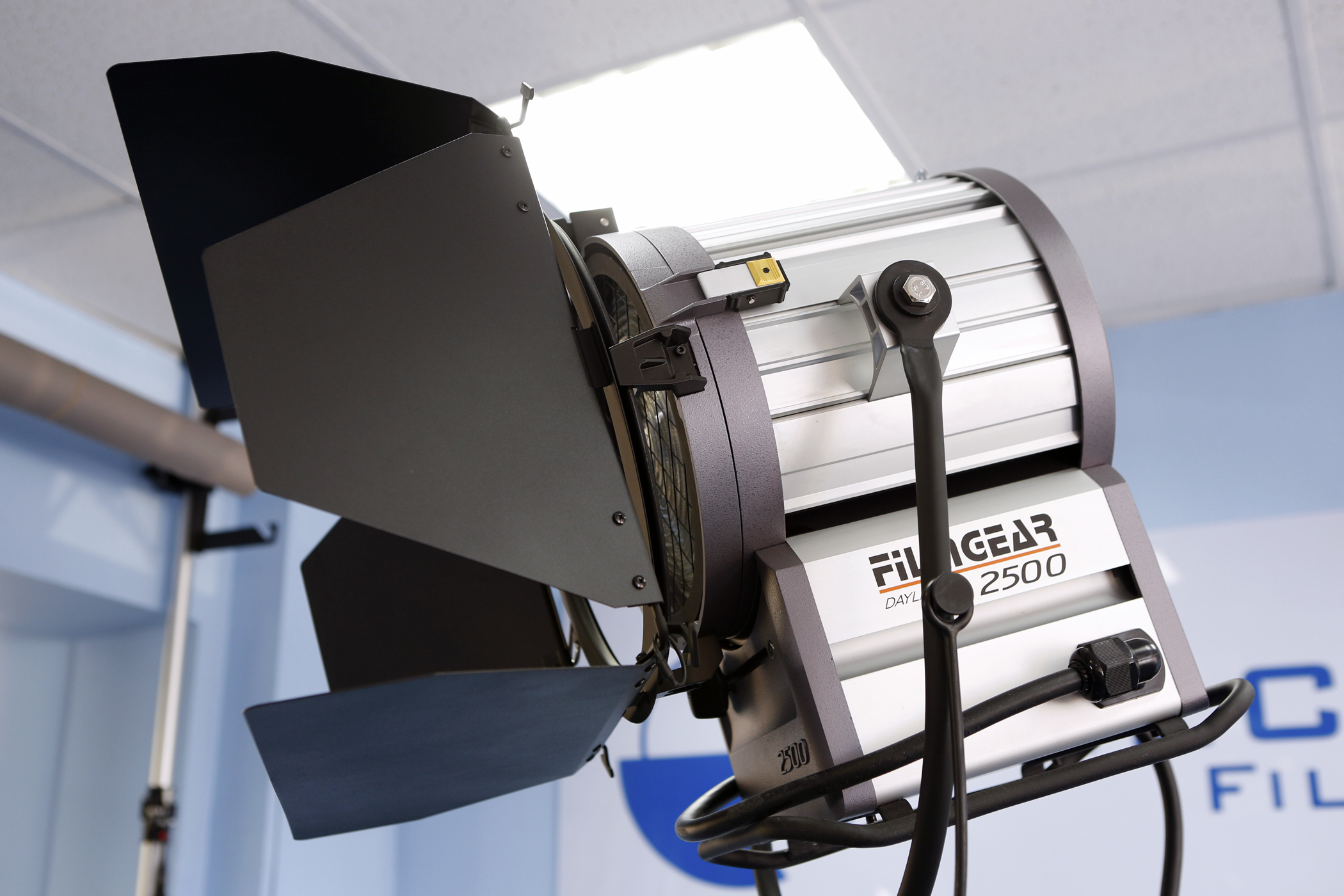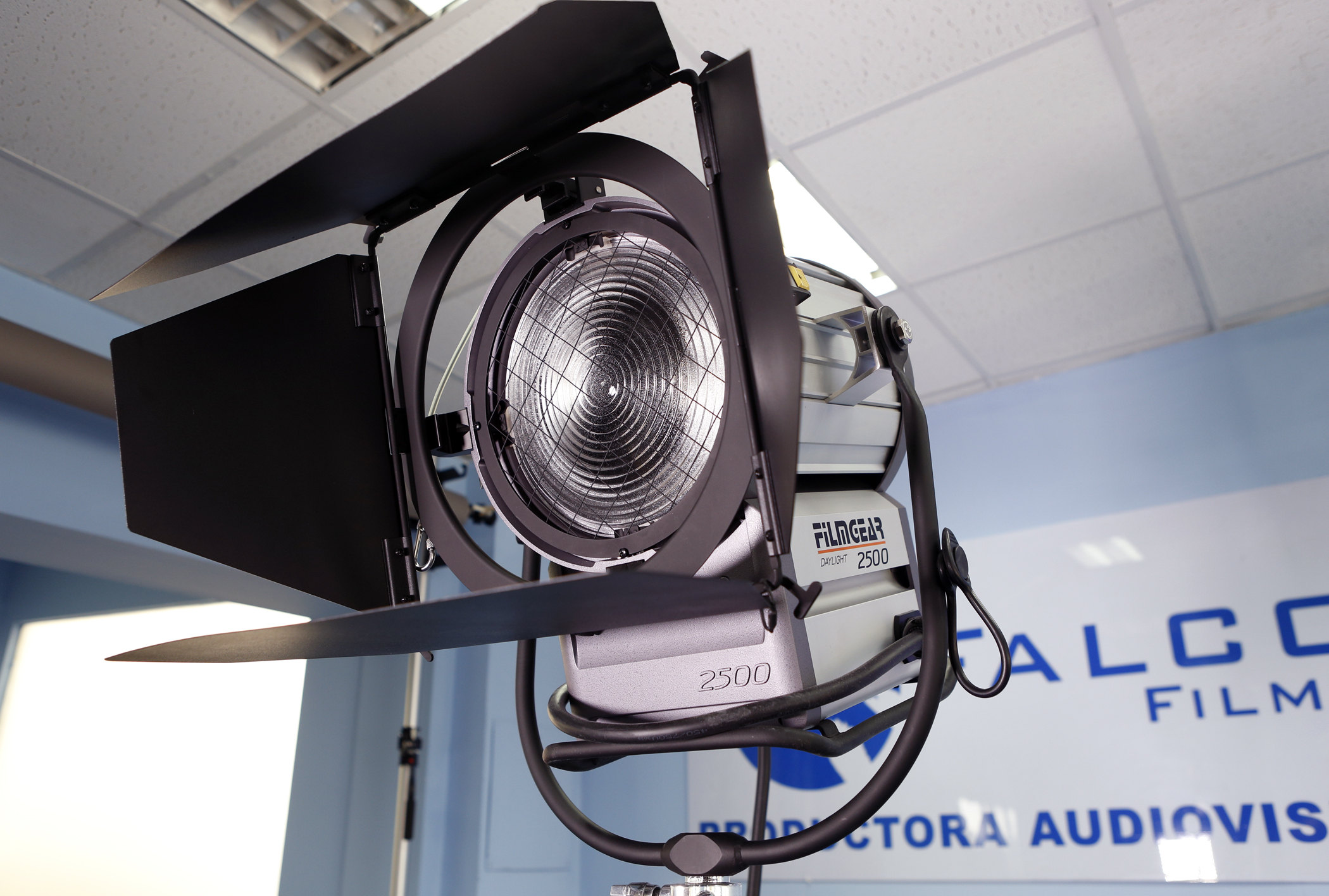 Lámpara HMI Fresnel 2500W Filmgear L02500DS, 16Kg, 220-240V, lente de 250mm, incluye ballast 4KW/2.5KW, pie, visera y manguera en alquiler.