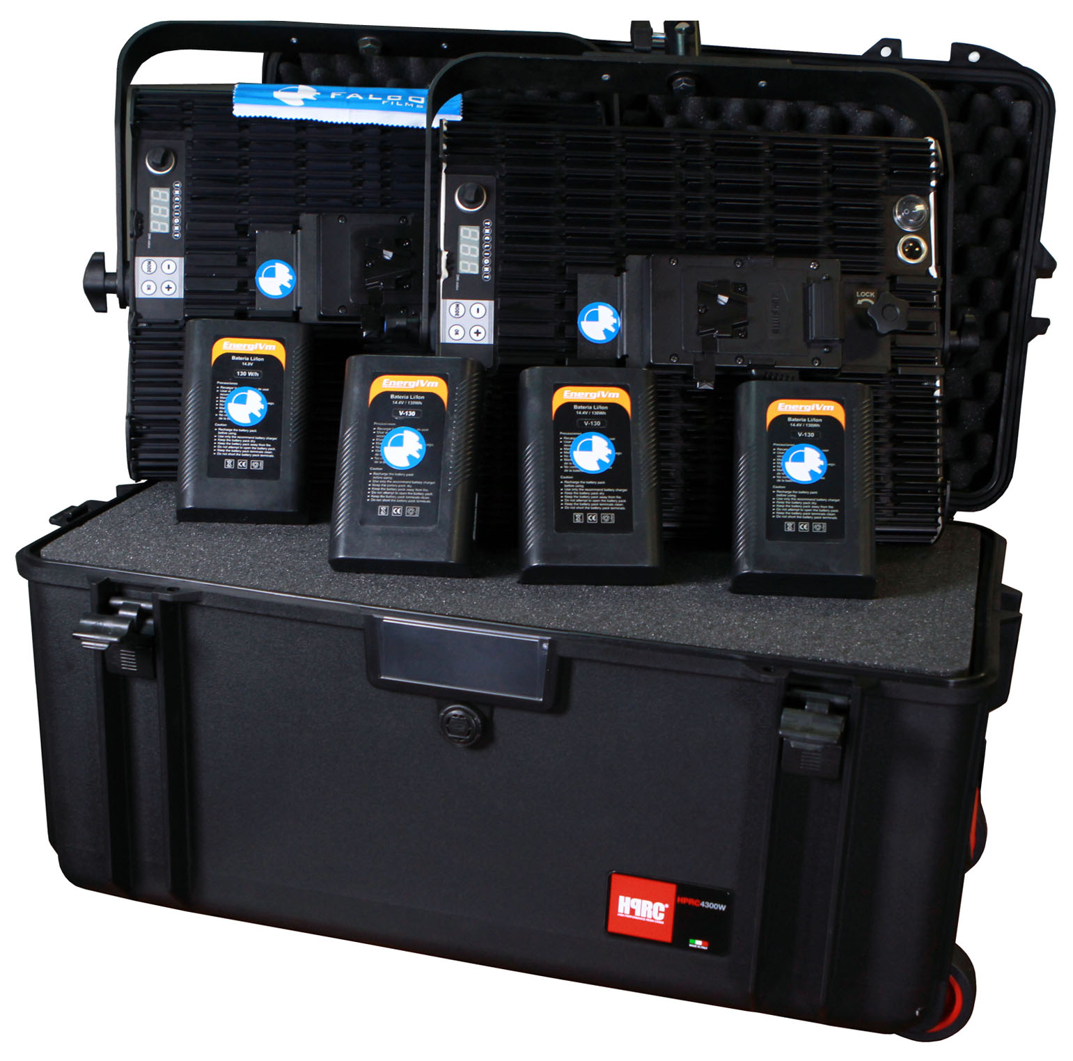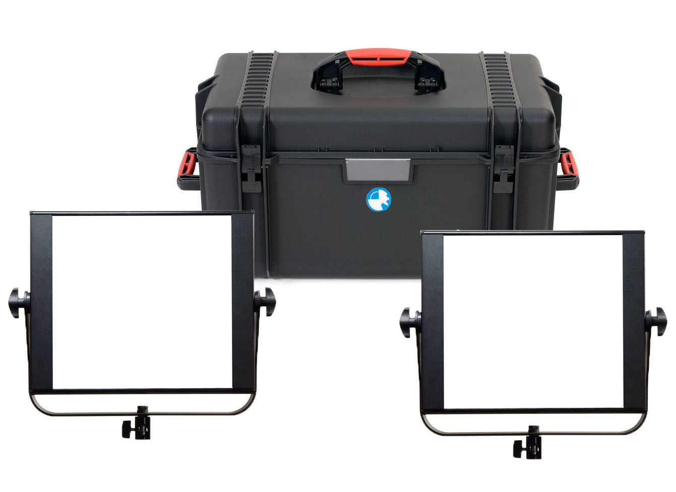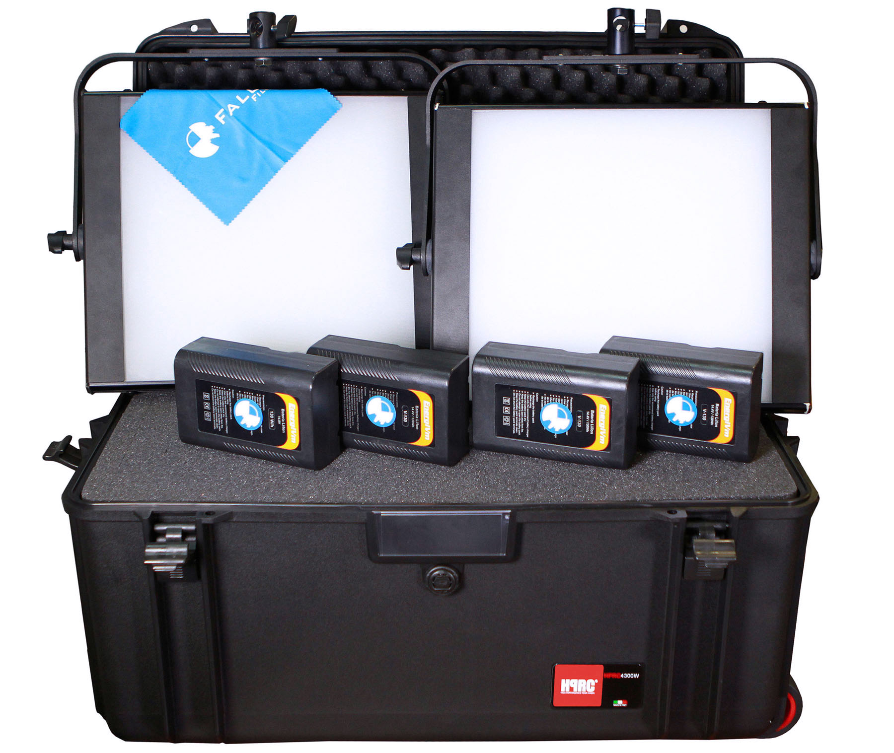 Kit LED VELVET: Incluye 2 pantallas VELVET1, 4 baterías V-LOCK, cargador, alimentador a red, pies de foco y maleta HPRC para alquiler.
