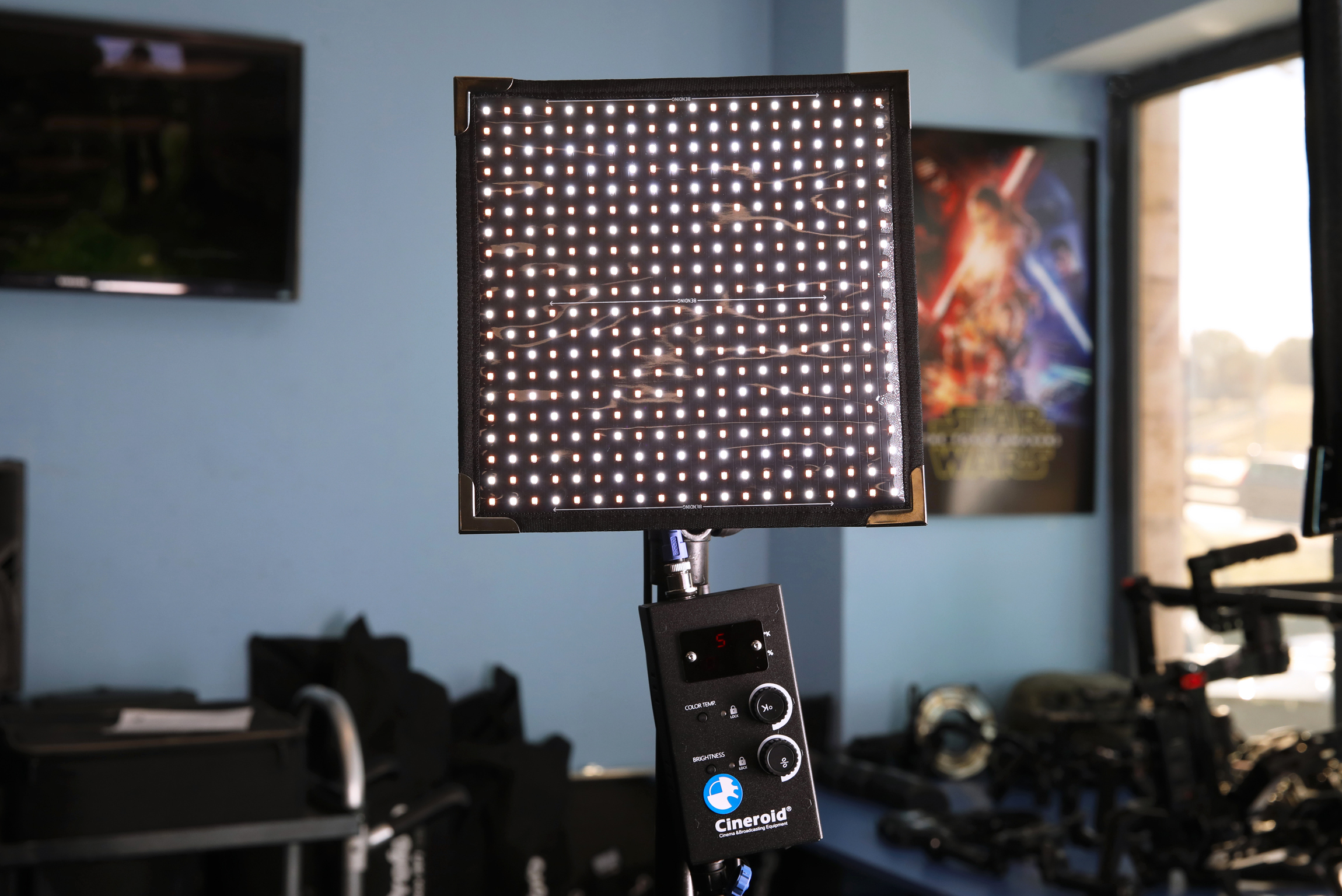 Panel LED flexible bicolor CINEROID FL400S: Impermeable, bicolor (2700°-6500°K), ligero, ultraslim, 2100 lux a 1m, dimmer 0-100%, dimensiones compactas 191x141x35mm.