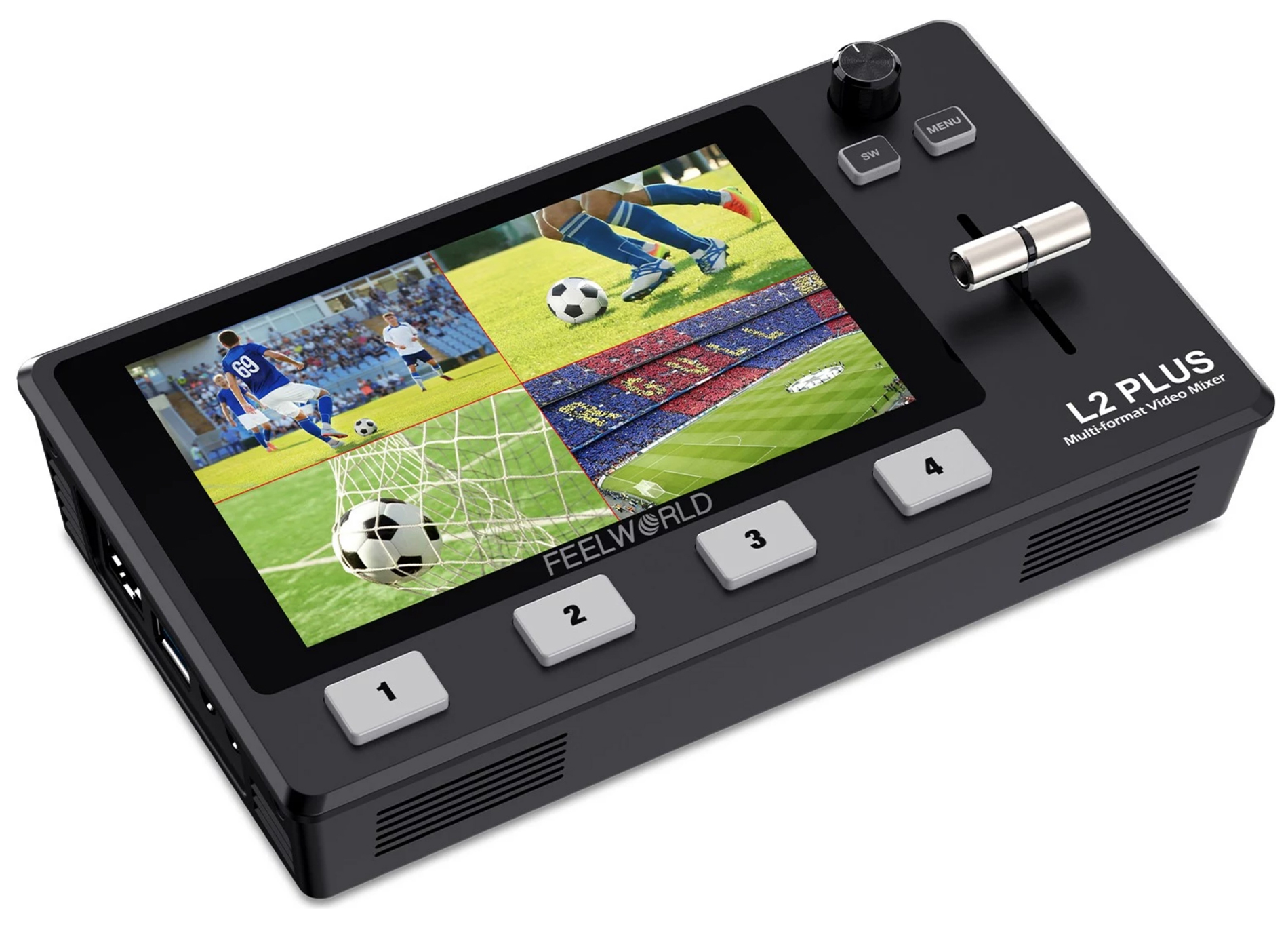 Mezclador de vídeo profesional multi-formato con cuatro entradas HDMI para transmisiones en directo.