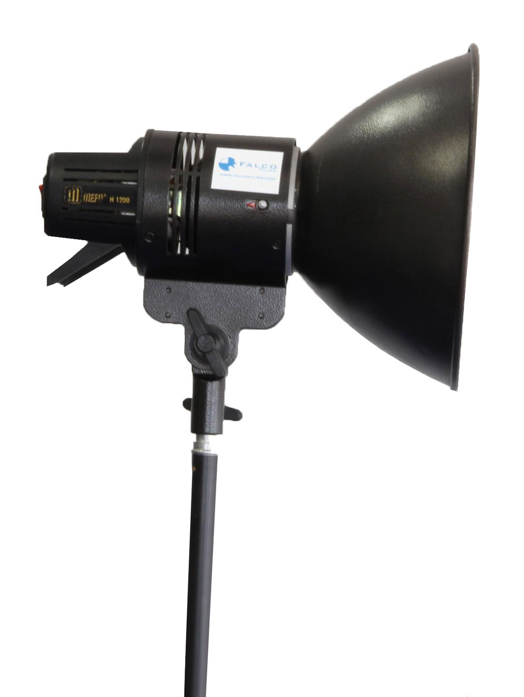 Foco halógeno MEFO H1200 de 1200W, ideal para estudios de fotografía, con ventilador interno y pie de foco incluido en alquiler.