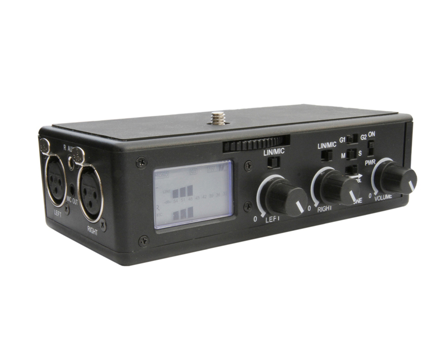 Su carcasa es de policarbonato resistente y tiene función AGC de ganancia, volumen de auriculares, selector salida mono/estéreo, selectores línea/micrófono, balance de canales, dos entradas XLR balanceadas, entrada auxiliar mini jack para micrófonos inalámbricos, salida mini jack a cámara, ajustes de ganancia HI/LO, selector de tierra para eliminar ruido y pantalla LCD.